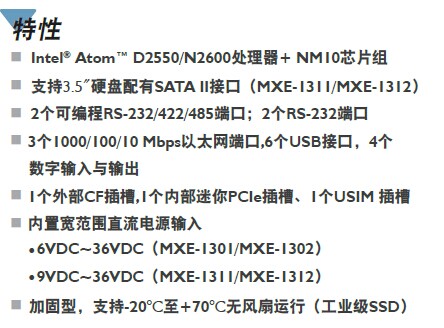 Intel® Atom™ D2550/N2600处理器 + NMI0 芯片组;支持 3.5〃硬盘配有 SATA II接口(MXE-1311/MXE-1312);2个可编程RS-232/422/485端口; 2个RS-232端口;3个 1000/100/10 Mbps以太网端口,6个USB接口,4个数字输入与输出;1个外部CF插槽,1个内部迷你PCIe插槽、I个USIM插槽;内置宽范围直流电源输入 •6VDC~36VDC (MXE-1301/MXE-1302) •9VDC~36VDC (MXE-1311/MXE-1312);加固型,支持-20°C至+70°C无风扇运行(工业级SSD).