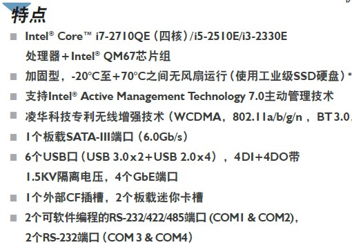 Intel®CoreTM i7-27IOQE (四核)/i5-25IOE/i3-2330E 处理器+ Intel® QM67芯片组;加固型,-20°C至+70°C之间无风扇运行(使用工业级SSD硬盘);支持Intel® Active Management Technology 7.0主动管理技术;凌华科技专利无线增强技术(WCDMA,802.11a/b/g/n,BT3.0, AGPS);1个板载SATA-III端口(6.0Gb/s);6个USB口(USB 3.0x2+USB 2.0x4),4DI+4DO带1.5KV隔离电压,4个GbE端口; 1个外部CF插槽,2个板载迷你卡槽;2个可软件编程的RS-232/422/485端口 (COM1&COM2),2个RS-232端口(COM3 & COM4)