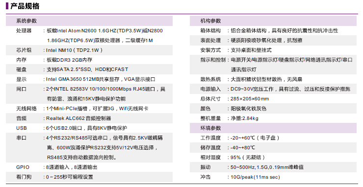 超大面积铝合金散热鳍片,免维护设计;CPU和内存采用BGA表贴工艺,宽温、耐压和长寿命的固态电容器;无线缆连接的磁盘安装方式;8KV静电保护、TVS 600W浪涌保护、2500VDC磁耦隔离的串口;采用凤凰端子紧固型的电源接口;可选配开关量光隔输入和继电器输出端子板.