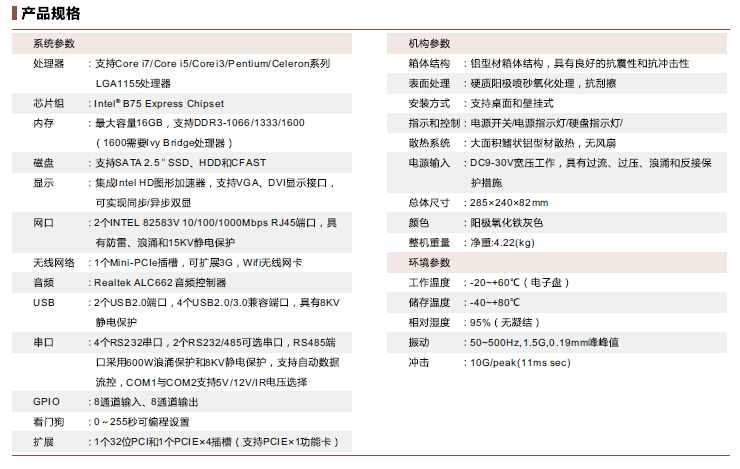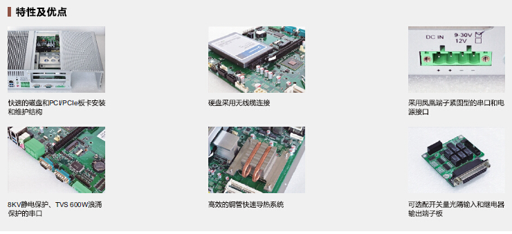 快速的磁盘和PCI/PCIe板卡安装和维护结构;硬盘采用无线缆连接;采用凤凰端子紧固型的串口和电源接口;8KV静电、TVS 600W浪涌保护的串口;高效的铜管快速导热系统;可选配开关量光隔输入和继电器输出端子板。