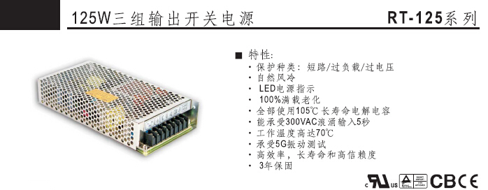 保护种类:短路/过负载/过电压;自然风冷;LED电源指示;100%满载老化;全部使用105°C长寿命电解电容;能承受300VAC浪涌输入5秒;工作温度高达70°C;承受5G振动测试;高效率,长寿命和高信赖度;3年保固。