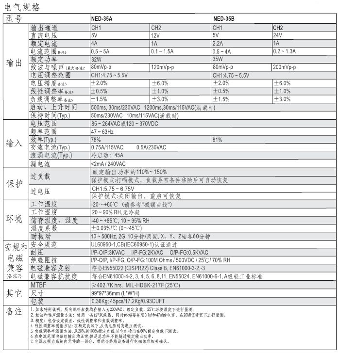 国际通用全范围交流输入 •保护种类:短路/过负载/过电压;100%满载老化测试;2年保固.