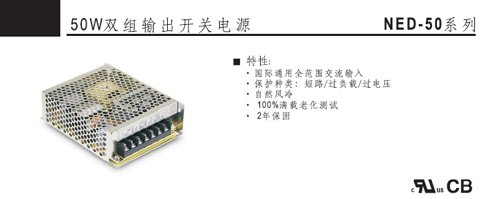 国际通用全范围交流输入;保护种类:短路/过负载/过电压;100%满载老化测试;2年保固.