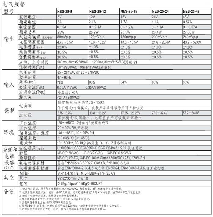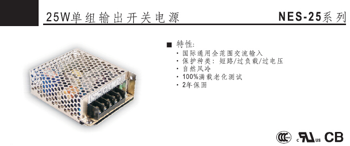 国际通用全范围交流输入;保护种类:短路/过负载/过电压;100%满载老化测试;2年保固.