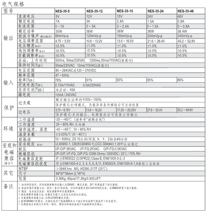 国际通用全范围交流输入;保护种类:短路/过负载/过电压;100%满载老化测试;2年保固。