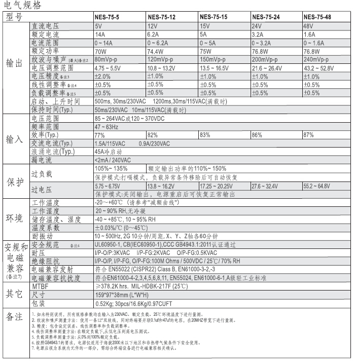 国际通用全范围交流输入;保护种类:短路/过负载/过电压;100%满载老化测试;2年保固。