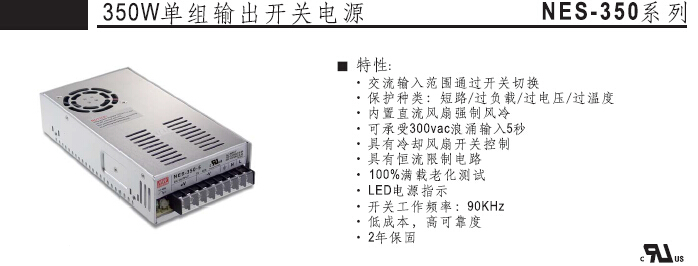 交流输入范围通过开关切换;保护种类:短路/过负载/过电压/过温度;内置直流风扇强制风冷;可承受300vac浪涌输入5秒;具有冷却风扇开关控制;具有恒流限制电路;100%满载老化测试;LED电源指示;开关工作频率:90KHZ;低成本,高可靠度;2年保固。