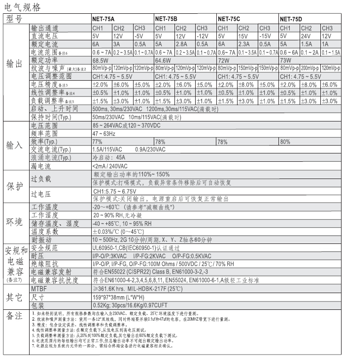 国际通用全范围交流输入;保护种类:短路/过负载/过电压;100%满载老化测试;2年保固。