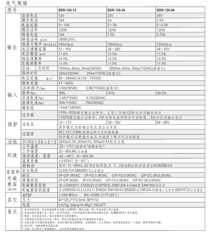 效率高达91 %,低损耗;150%高峰负荷能力;内置主动式PFC功能,PF>0.93;保护种类:短路/过负载/过电压/过温度;自然风冷;安装轨道:TS-35/7.5 或 TS-35/15;通过UL508 (工业控制设备)认证;EN61000-6-2(EN50082-2)工业耐受等级;内建DC OK继电器触点;100%满载老化测试;3年保固.