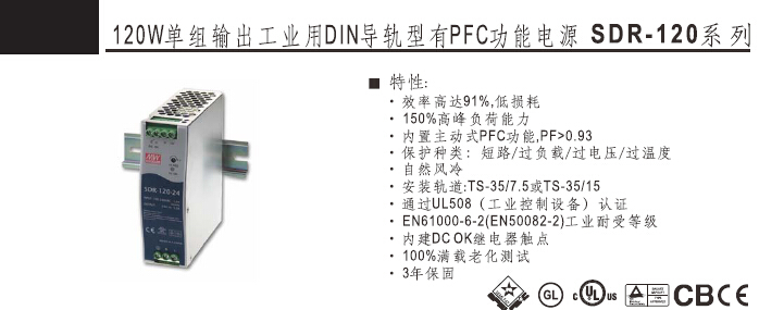 SDR-120系列 120W单组输出エ业用DIN导轨型有PFC功能电源