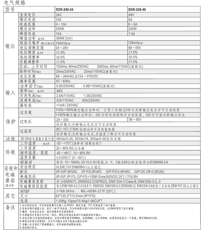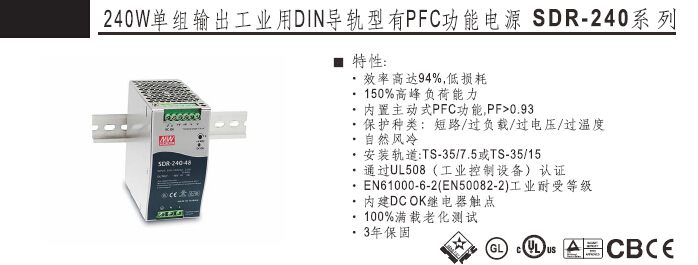 效率高达94%,低损耗;150%高峰负荷能力;内置主动式PFC功能,PF>0.93;保护种类:短路/过负载/过电压/过温度;自然风冷;安装轨道:TS-35/7.5 或 TS-35/15;通过UL508 (工业控制设备)认证;EN61000-6-2(EN50082-2)エ业耐受等级;内建DCOK继电器触点;100%满载老化测试;3年保固。