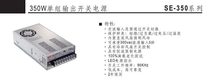 交流输入范围通过开关切换;保护种类:短路/过负载/过电压/过温度;内置直流风扇强制风冷;可承受300vac浪涌输入5秒;具有冷却风扇开关控制;具有恒流限制电路;100%满载老化测试;LED电源指示;开关工作频率:90KHZ;低成本,高可靠度;2年保固。
