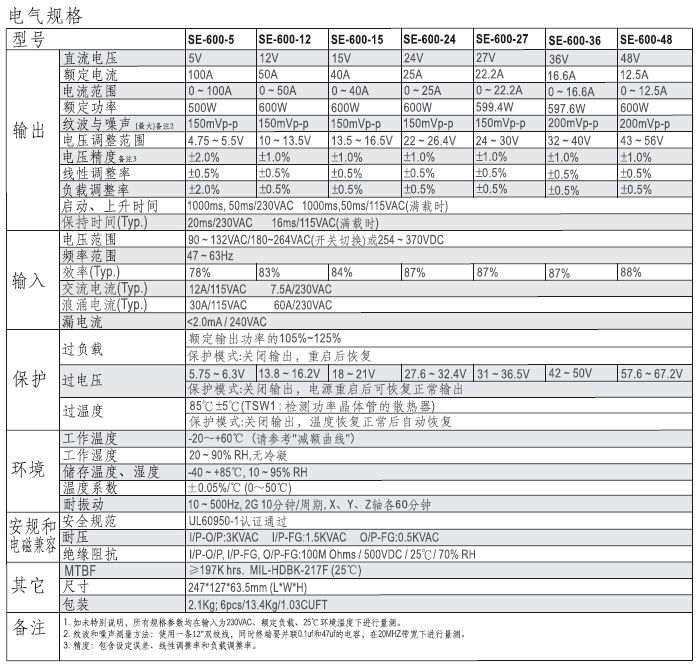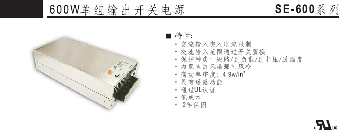 交流输入突入电流限制;交流输入范围通过开关置换;保护种类:短路/过负载/过电压/过温度;内置直流风扇强制风冷;高功率密度:4.9w/in3;具有遥感功能;通过UL认证;低成本;2年保固。
