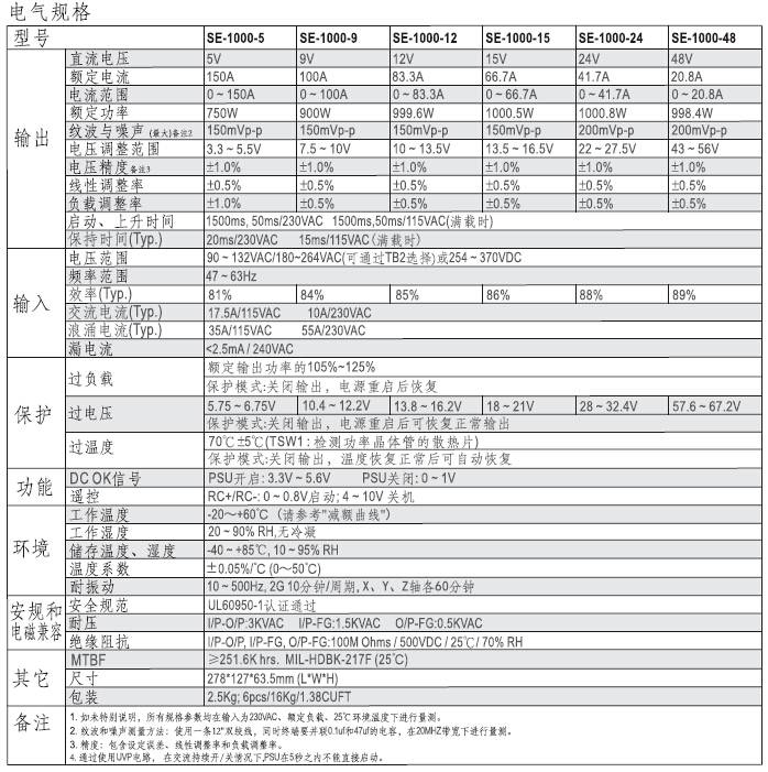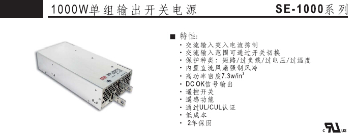 交流输入突入电流抑制;交流输入范围可通过开关切换;保护种类:短路/过负载/过电压/过温度;内置直流风扇强制风冷;高功率密度7.3w/in3;DC OK信号输出;遥控开关;遥感功碰;通过UL/CUL认证;低成本;2年保固。