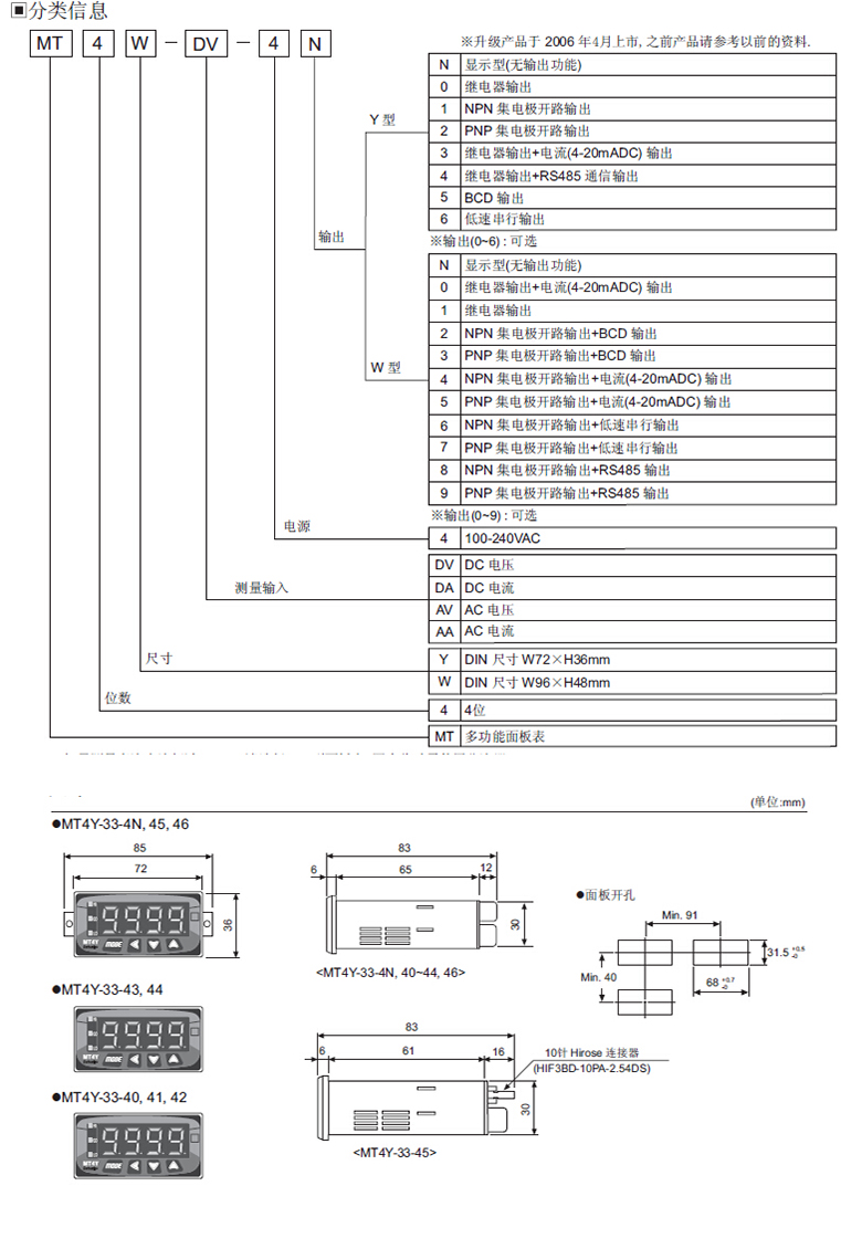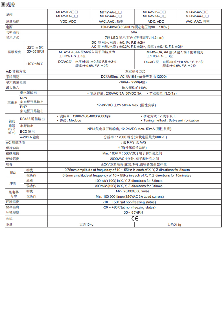 超级功能面板表;多种输出选择(基本规格:显示型)RS485通信输出,低速串行输出,电流(4-20mA), BCD输出,NPN/PNP集电极开路输出,继电器输出;最大测量输入规格:500VDC, 500VAC, DC5A, AC5A;最大显示范围:-1999 ~9999;高/低限位缩放功能;AC频率测量功能:0.1~9999Hz;多种功能:最大和最小值监视功能,显示周期延迟功能,归零功能,显示校正功能,电流输出缩放功能;宽电源范围:100-240VAC.