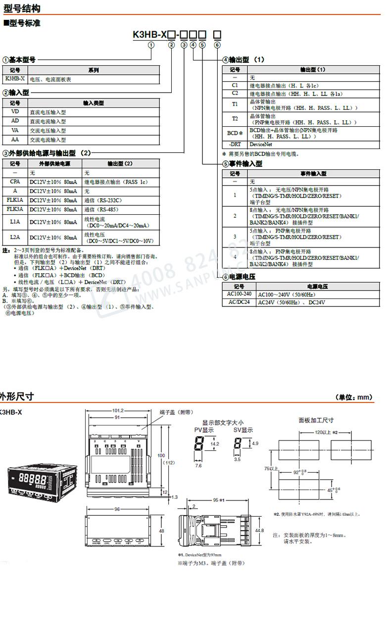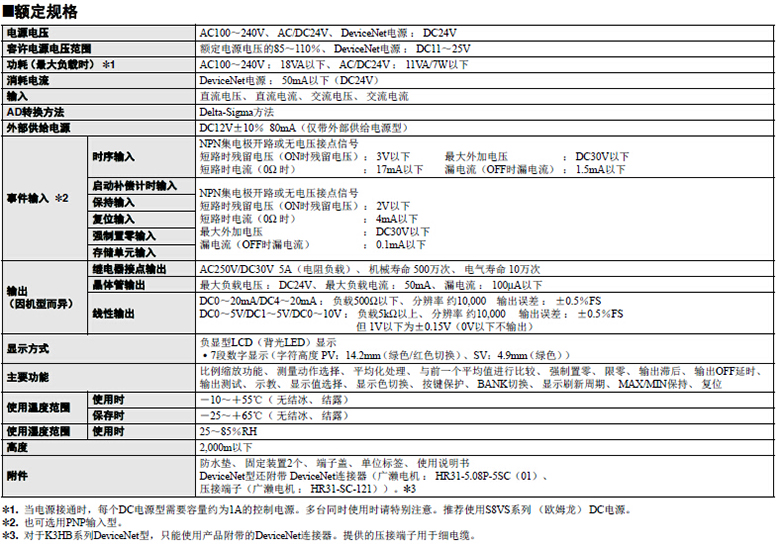 动作判定显示色,可切换绿色/红色2种显示颜色;配备的分压计用于监视操作趋势;外部事件输入可应用于各种测量和辨别情况;DeviceNet型的系列化;进深(面板以下)仅为95mm的超短尺寸;2 •UL标准适用认证(标识认证);经第三方机构认证,符合CE标志;NEMA4X标准(相当于IP66)的防水构造;“无输出”和“DeviceNet”型、无”动作判定显示色”功能;设定可切换显示色,动作判定无法切换;DeviceNet型为97mm.