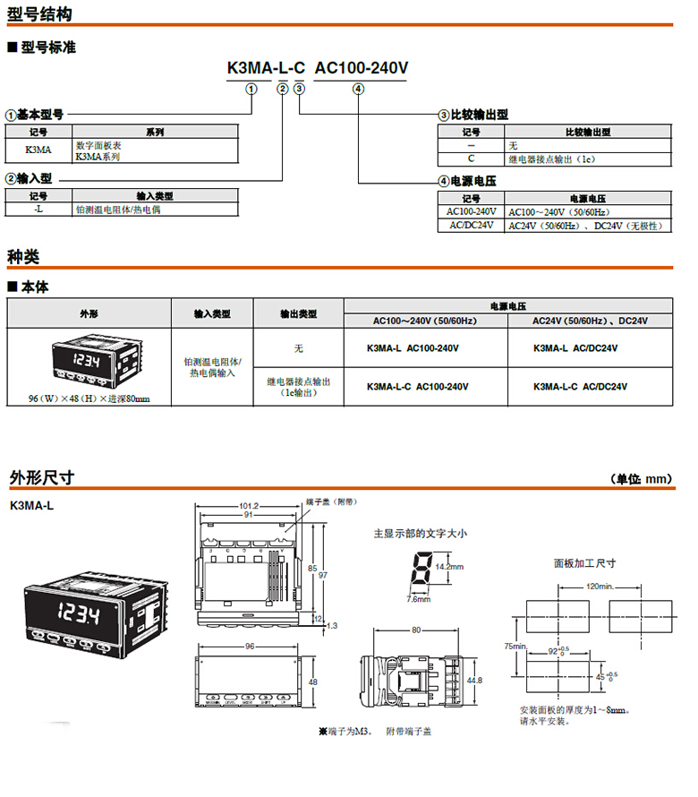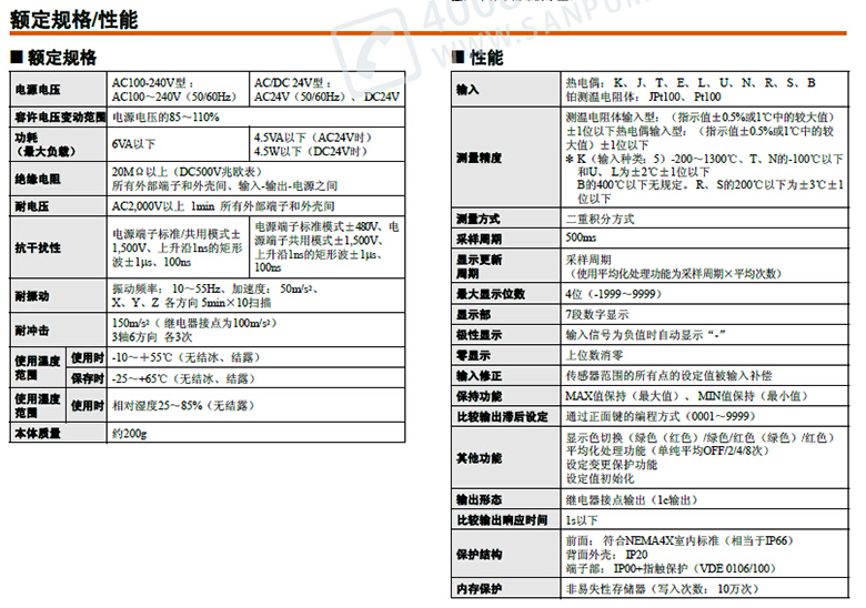 使用带背光双色LED (红色/绿色) 阴极LCD显示,实现高度可视性;输入为测温电阻体(2种)、热电偶(10种)的大范围;通过正面键操作设定简单;配备控制分散的平均化处理功能;配备温度偏移功能、温度单位切换功能;便于确认的MAX/MIN显示;进深(面板以下)仅为80mm的超短尺寸;标准配备防触电的端子盖;正面部分为保护构造NEMA4X (相当于IP66)标准的防水、防尘构造;UL标准适用认证(标识认证);符合CE标记.